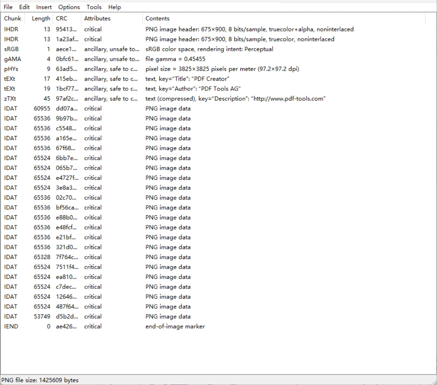 ::: details 做做了解好了 这里需要探讨下 idat 块的大小限制,通过脚本,可以实现任意大小的 idat 块的实现,通过 ai 的解释,目前常见的 idat 块最大是 65536 字节,它是由于 zlib 的默认缓冲区通常是 64KB 而限制的,当字节数达到 65536 的时候,为了适应缓冲区,我们就直接打包成一个 idat 块,然而对于不同的平台,或编译器,甚至人为,能产生不同版本的 idat 块。这是因为 idat 块只有唯一种压缩算法(deflate),最后出现在显示屏上的是所有 idat 块按照顺序拼接得到的结果,这也就可以解释为什么有的 idat 块明明没有达到自身最大的 idat 块的时候直接打包,进入下一个 idat 块的编写的时候,文件依然可以正常打开查看