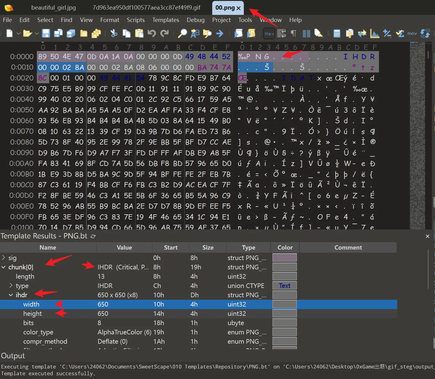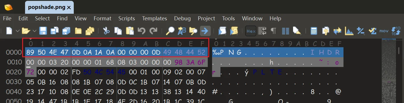 - 首先用010锁定ihdr块,然后手动编辑,width对应的宽度,height对应的高度,更改数字即可