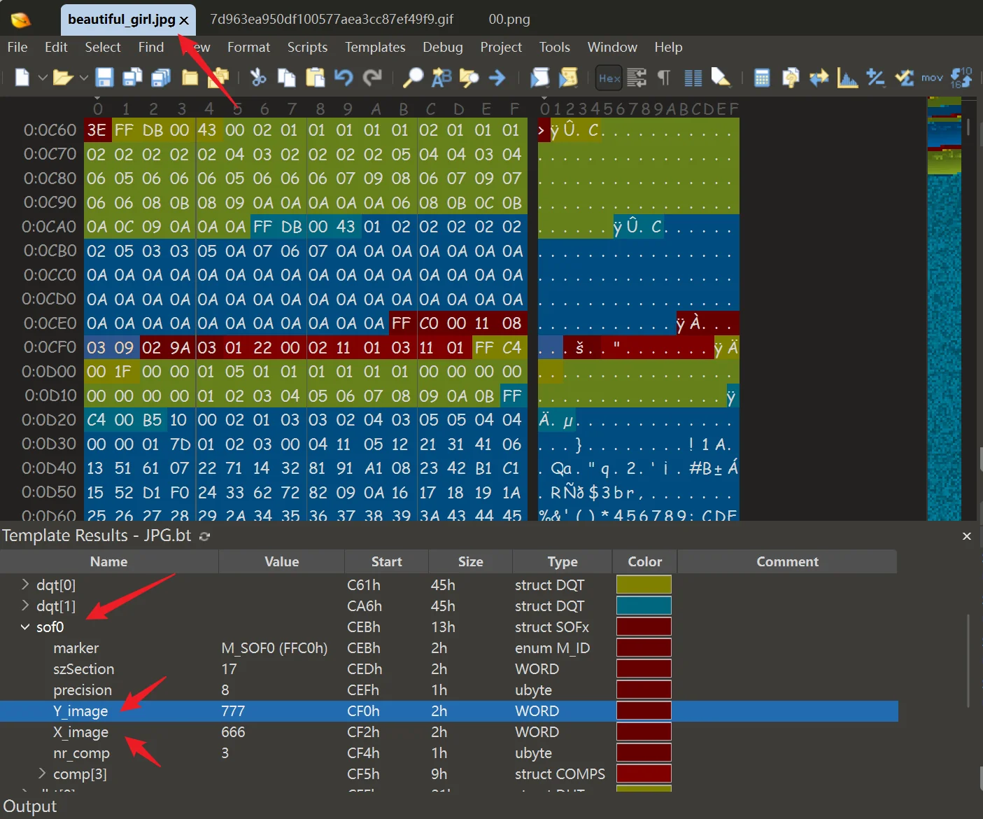 - 用010锁定sof0数据块,图片的宽高在这里控制,同样直接更改数字,然后保存即可