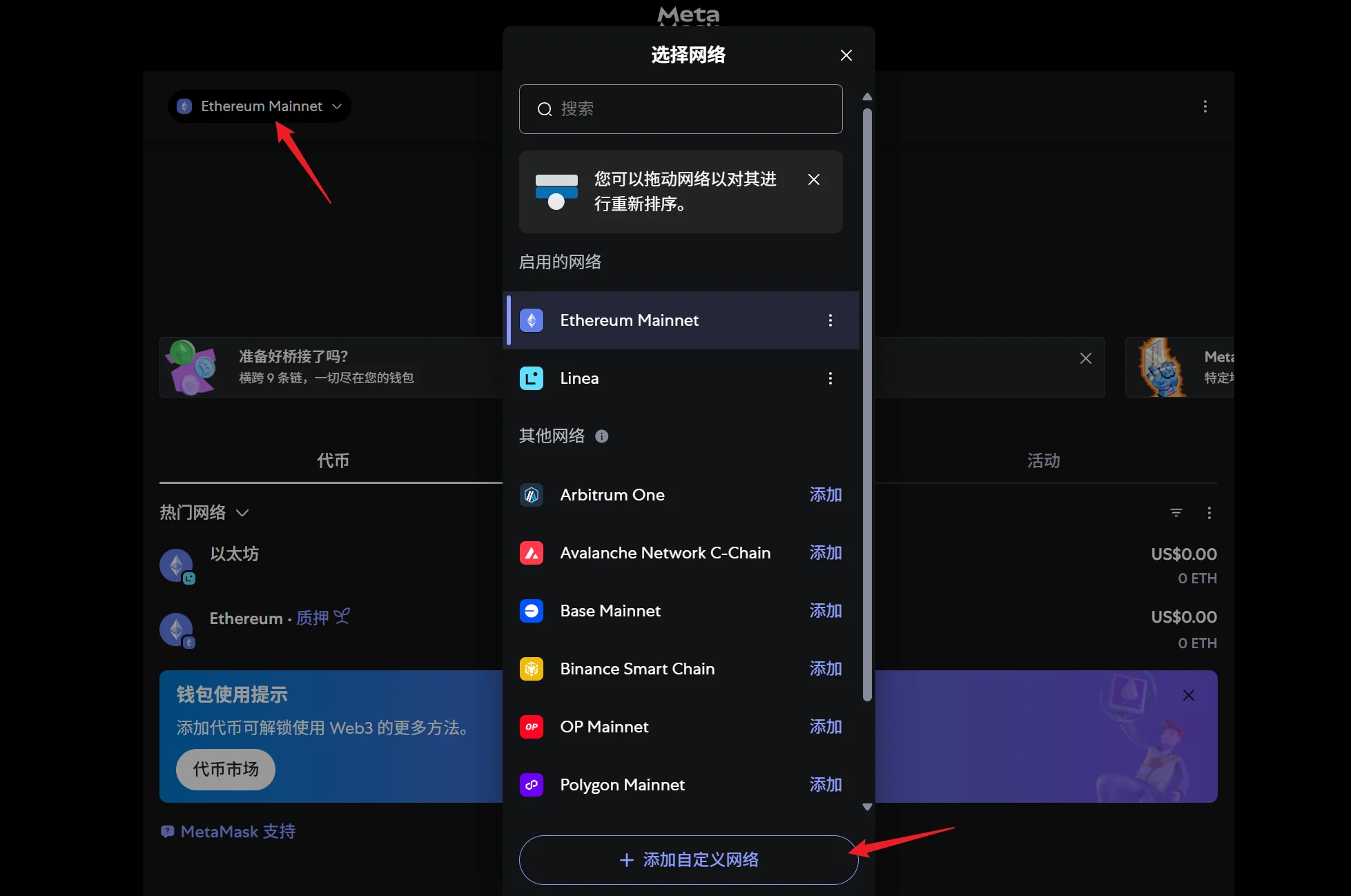 点击左上角的Ethereum Mainnet,会进入选择网络的功能,选择添加自定义网络