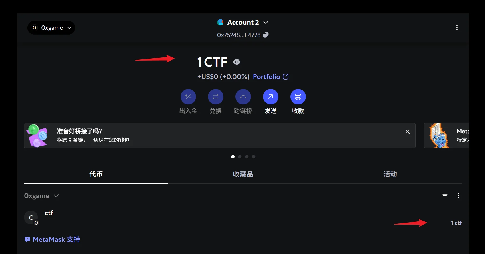 将private key复制进去,导入即可,可以看到,已经有初始余额1ctf了