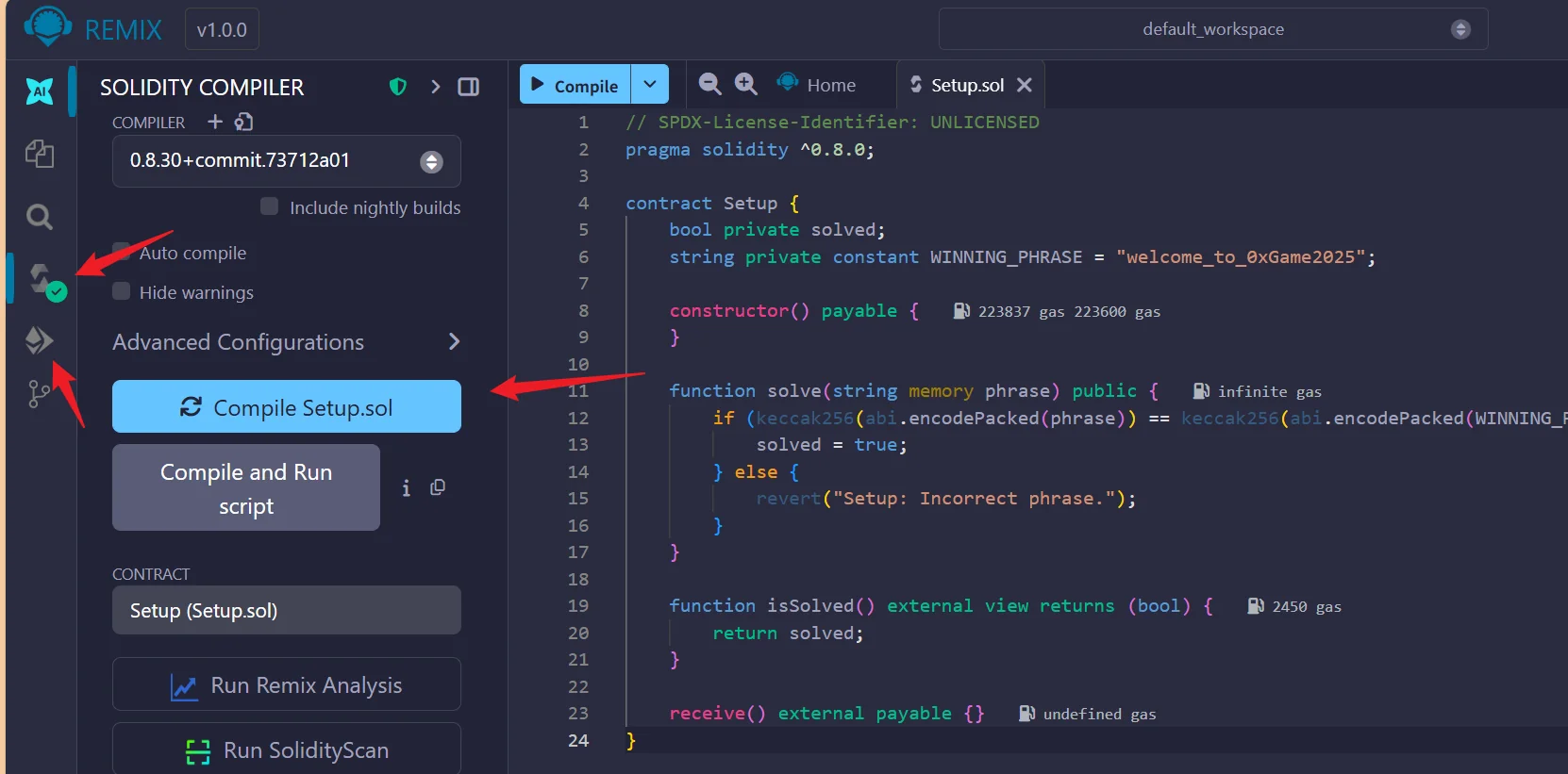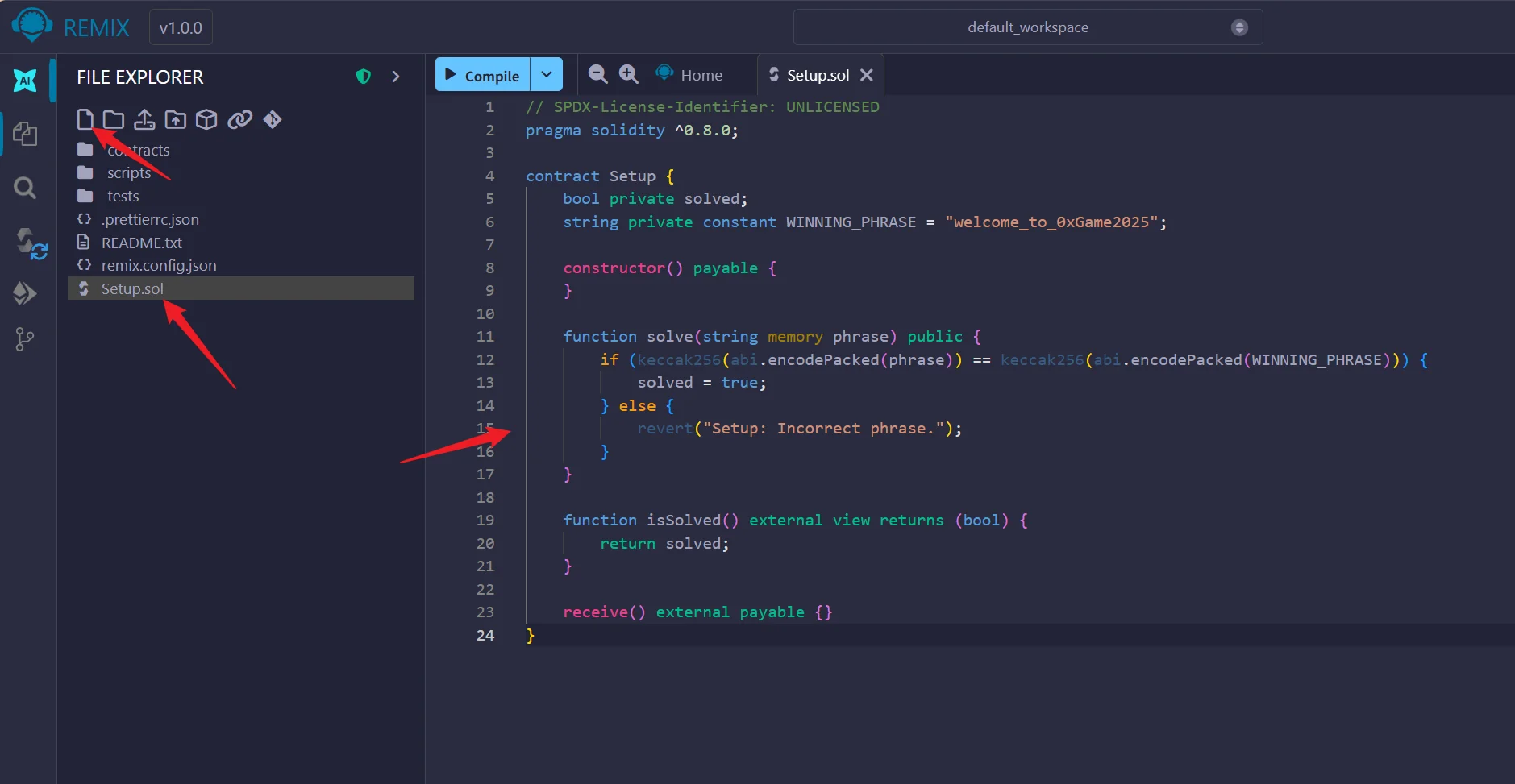 新建个sol文件,将题目下发的Setup.sol复制进去,文件名也要一样的喔,这里设计合约里面的合约名,总之就是要一样