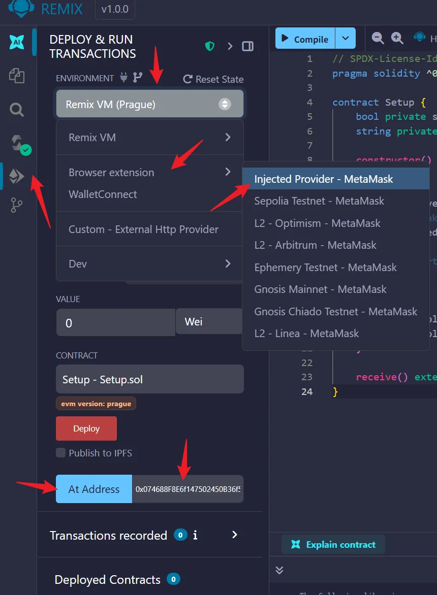这里进行部署,需要先设置环境,选中浏览器插件–>Injected Provider-MetaMask会自动关联当前钱包用户以及对应网络,然后再将合约地址复制过来,粘贴到At Address中,点击即可(要大致理解,我们的挑战合约应该部署到题目下发的那个地址,不然我们要是成功了,题目怎么判定呢?