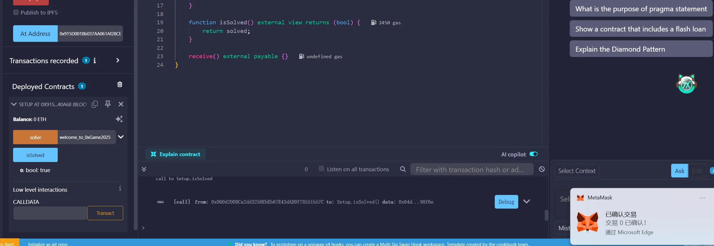 ,只有这样,才能让solved返回true,才算完成了挑战(真的是简单上链吧,算是0xgame2025teching.assets的一个签到题