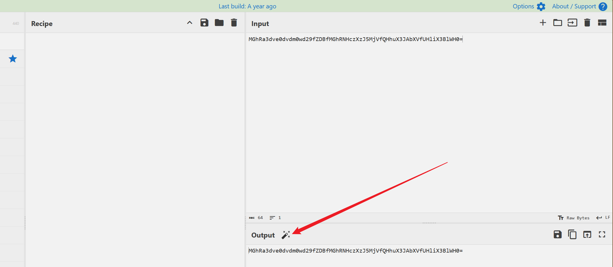 简单说说工具的使用,请注意,如果这里output右侧出现魔法棒,就说明,工具已经检测出字符串的可能编码方式,点击即可