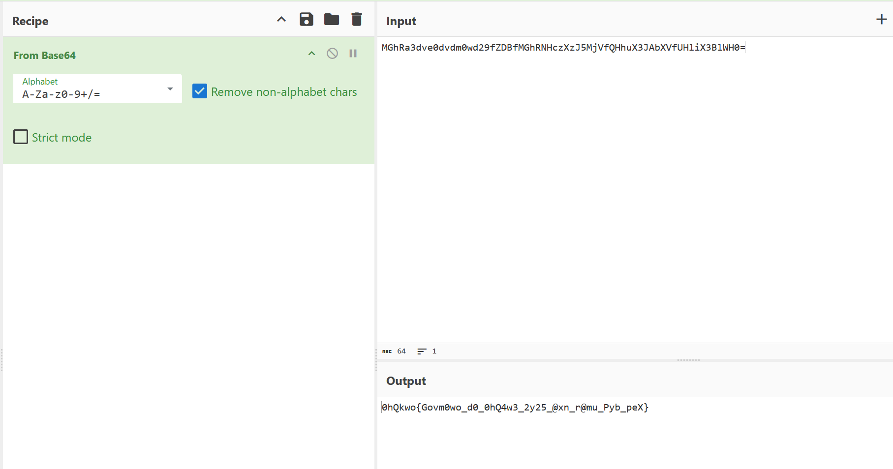 Recipe中出现From base64,同时output也大变样,形式上很像我们要提交的flag