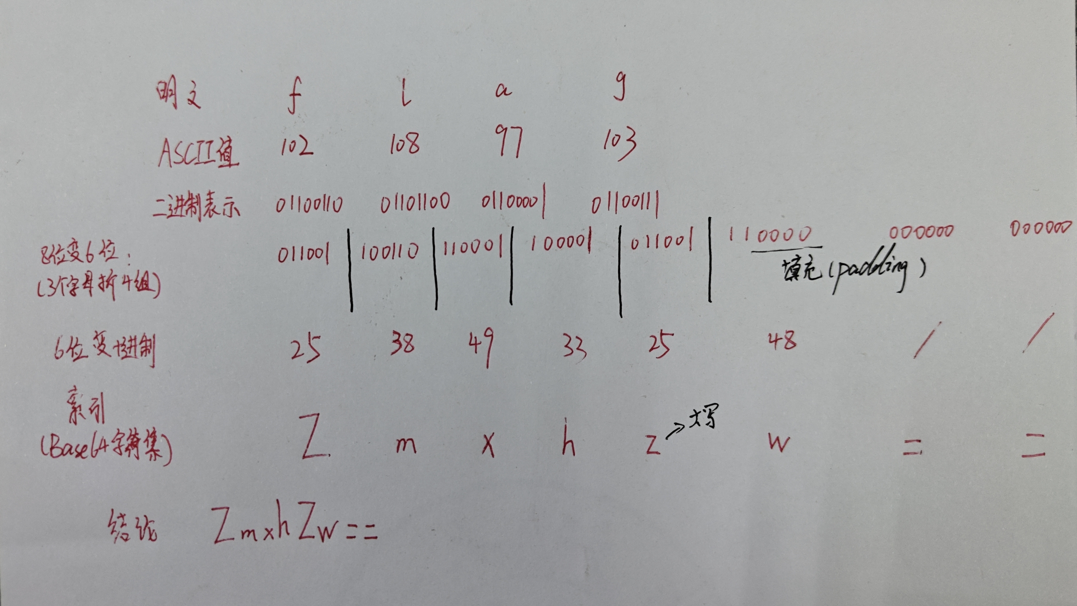 编码原理如下,先将传输的信息转换成二进制,然后这里的二进制串都是8位的,接下来8位变6位,3个字母拆4组,接着6位二进制变十进制,然后按照十进制在Base64字符集中进行索引,上面说的3个字母拆4组,如果说拆的时候不够拆了,要用0填充,但是全是0的那组下面转换索引值后,用=号填充